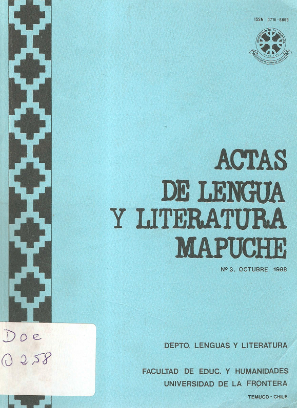 Vol. 3 No. 01 (1988)Tenemos el agrado de entregar el tercer volumen de las Actas de Lengua y Literatura Mapuche, que, tal como ocurrió en 1984 y 1986, reúne la mayoría de las ponencias presentadas en las III Jornadas de Lengua y Literatura Mapuche, efectuadas en nuestra universidad los días 19, 20 y 21 de octubre de 1988.